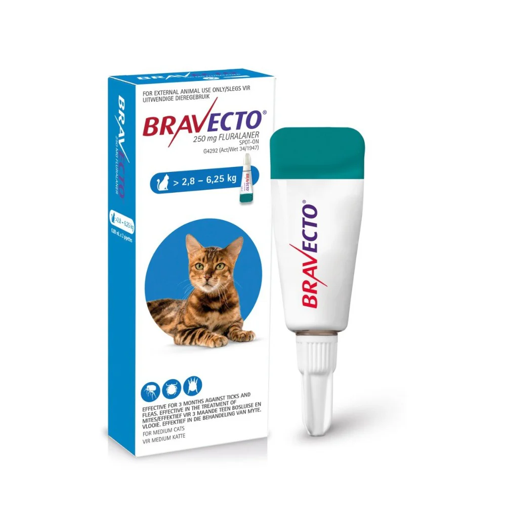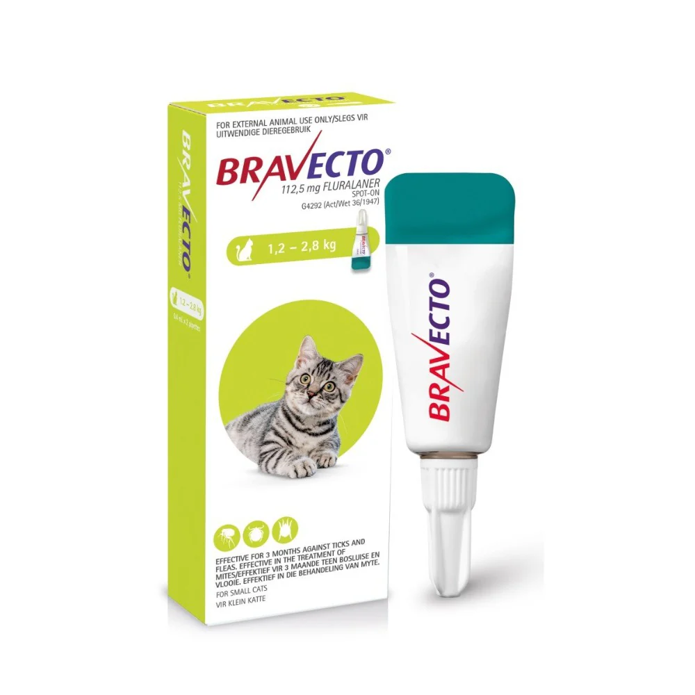 BRAVECTO® SPOT ON for Small (1.2–2.8kg), Medium (2.8–6.25kg), Large (6.25–12.5kg) Cats is a Spot-On product for the treatment and prevention of tick, flea and ear mite infestations in cats over 11 weeks of age.