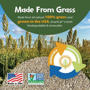 Easier to carry, easier to scoop and easier to clean. On top of that it’s made from 100% USA farmed grass, with no added chemicals or fragrances. SmartCat All Natural Clumping Litter will biodegrade after disposal as a renewable resource. It’s very soft on paws and can be used for younger cats.